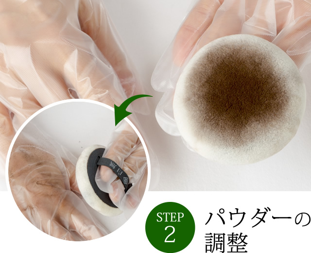 ビニール手袋にパフをつけてみてパウダーの付き具合を調整してください。